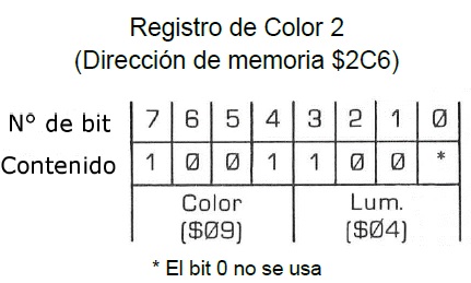 Como puede ver, este programa carga el Registro de Color 2 (dirección $ 02C6) con el color #$09, y luminancia #$04, o sea, el color azul claro que Atari utiliza para el fondo de su pantalla estándar de GRAPHICS 0. Si ensamblamos el programa y lo ejecutamos, estos son los valores que quedarán en cada bit del Registro de Color 2 (dirección de memoria $02C6) de su computador.