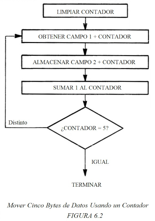 En la familia de microprocesadores MCS650X, al contador se le llama "registro Índice". Es un registro de 8 bits que se carga desde la memoria y tiene la posibilidad de que se le sume 1 mediante una instrucción de incremento (INX, INY). Se pueden comparar directamente con la memoria utilizando la instrucción de comparación de índice (CPX, CPY). El ejemplo 6.4 muestra el listado del programa para el diagrama de flujo de Figura 6.2.