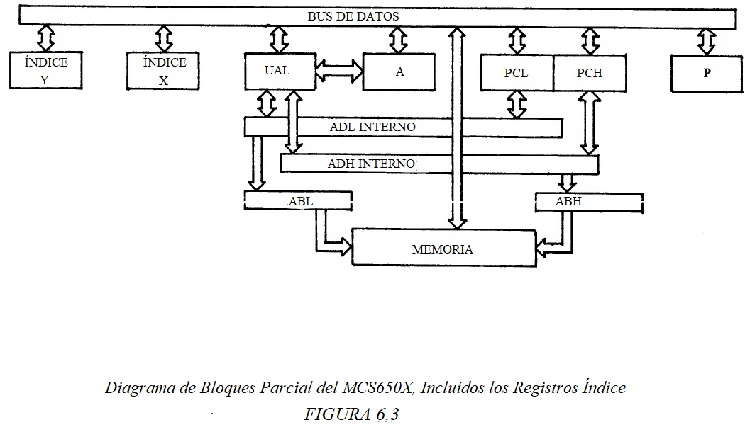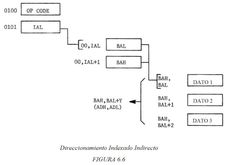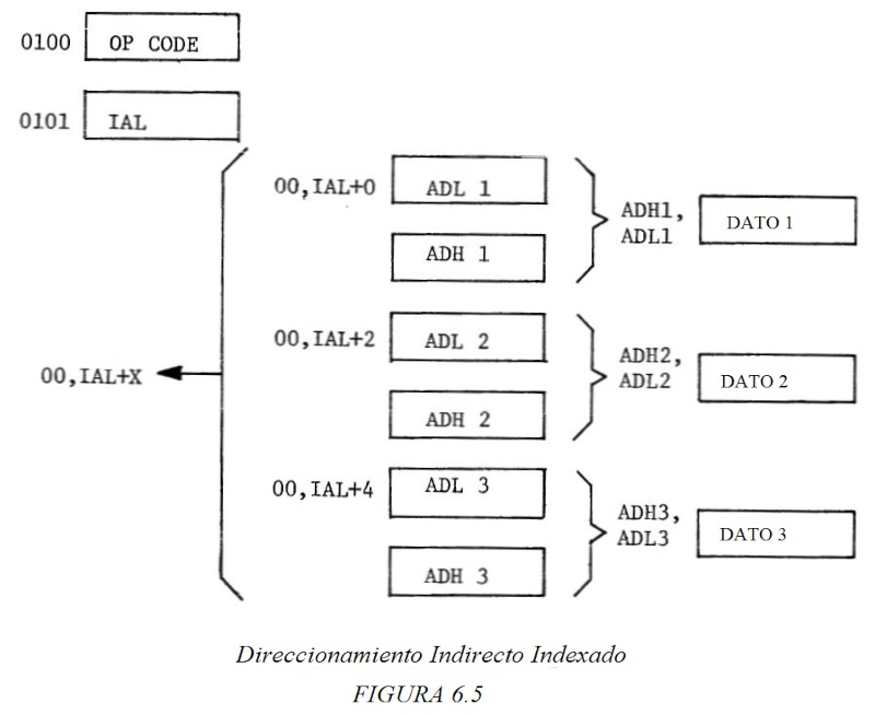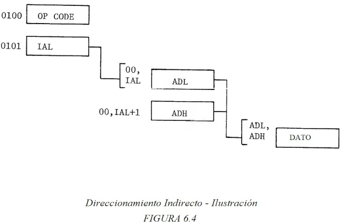 En la familia MCS650X, las operaciones indirectas tienen una estructura especial. La estructura básica del direccionamiento Indirecto es el de una instrucción que consta de un OP CODE seguido de una dirección de la Página Cero. El microprocesador obtiene la dirección efectiva de la operación tomándola desde la dirección en la Página Cero. La operación del direccionamiento Indirecto es muy similar al direccionamiento Absoluto, excepto que el direccionamiento Indirecto utiliza una operación de direccionamiento de Página Cero para acceder a la dirección efectiva. En el caso del direccionamiento Absoluto, el valor del Contador de Programa se utiliza como la dirección de donde se debe obtener el byte inferior de la dirección efectiva; luego se suma uno al Contador de Programa, el que se utiliza para obtener el byte superior de la dirección efectiva. En el caso de direccionamiento Indirecto, el valor que viene a continuación, del OP CODE, que es direccionado por el Contador de Programa, es utilizado como un puntero para direccionar el byte inferior de la dirección efectiva en la Página Cero. A continuación, el puntero se incrementa en uno con el byte superior de la dirección efectiva obtenido desde la siguiente posición de memoria. El siguiente ciclo coloca el byte superior (ADH) y el byte inferior (ADL) de la dirección efectiva en el bus de Direcciones, para finalmente obtener los datos. Una ilustración de esto se muestra en la Figura 6.4.